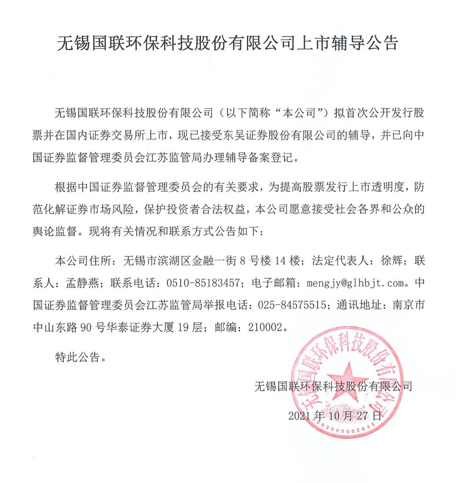 無錫國聯(lián)環(huán)保科技股份有限公司成立于2011年1月27日,是一家以污泥減量化、無害化、資源化處置為產(chǎn)業(yè)化發(fā)展的國有控股企業(yè),股本為109,470,852元。